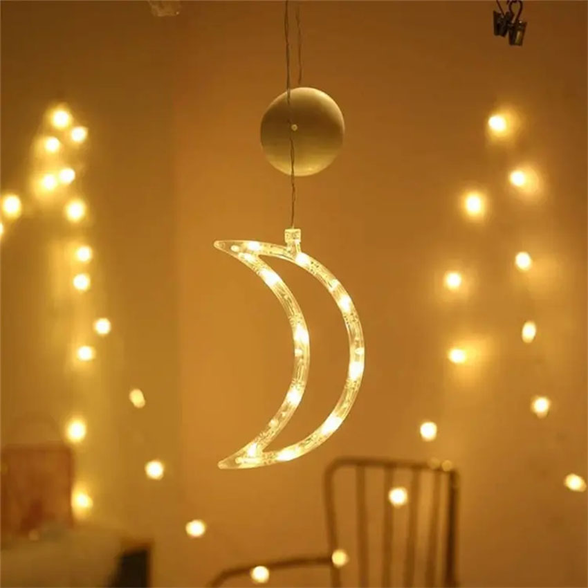• [colgante a pilas] con ventosa, luz [blanca cálida], diseño de [luna] (ideal para decoración) y [ambientes relajantes]. [seguridad] garantizada.